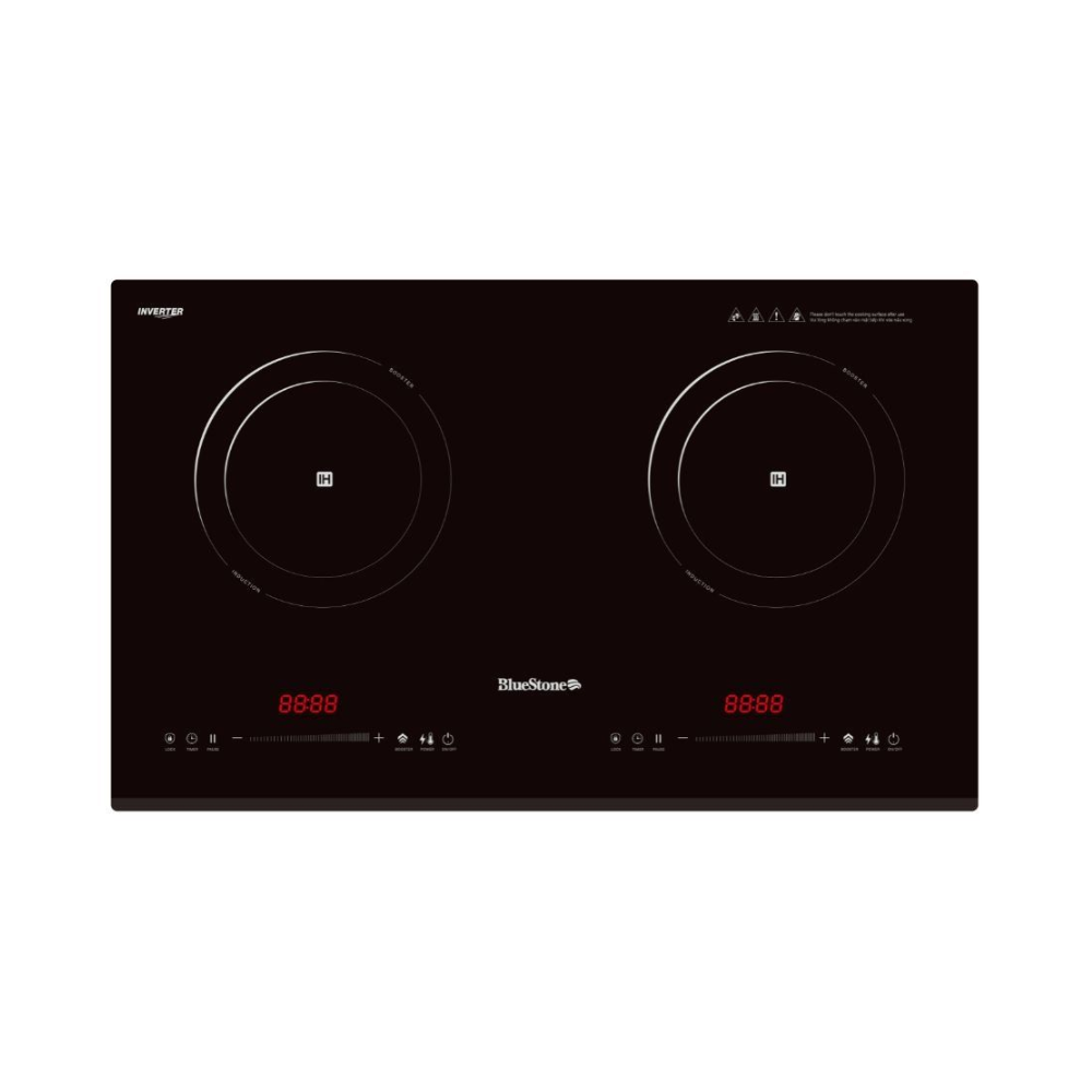 Bếp từ đôi lắp âm Bluestone ICB-6825 có thể lắp âm để mặt bếp phẳng với mặt đá hoặc lắp dương trong những gian bếp chưa tiện thi công tủ. Thiết kế hai vùng nấu bố trí đối xứng, mỗi vùng đường kính khoảng 18 cm, phù hợp với đa số nồi chảo gia đình.