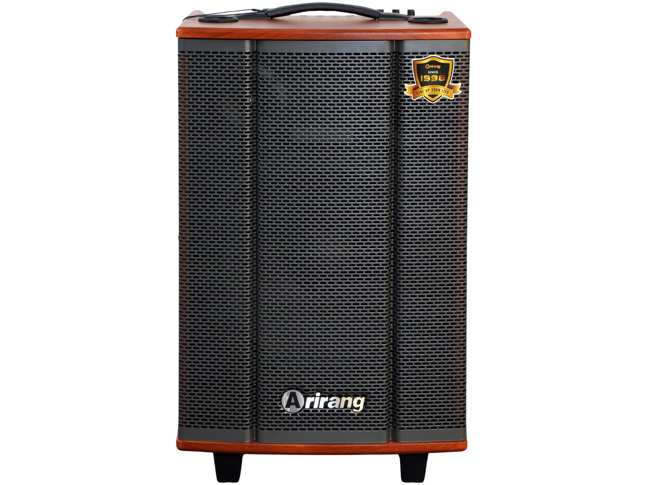 Arirang MKS2.5 có kích thước gọn 350 x 300 x 560 mm, trọng lượng 11kg, dễ dàng đặt trong nhà, lớp học hay mang đi dã ngoại. Thùng loa bằng gỗ kết hợp mặt lưới thép sơn tĩnh điện bảo vệ củ loa và board mạch, đồng thời triệt tiêu rung động không mong muốn. Loa còn trang bị 4 bánh xe lớn và tay kéo chắc chắn, giúp việc di chuyển giữa các không gian trở nên tiện lợi và linh hoạt.